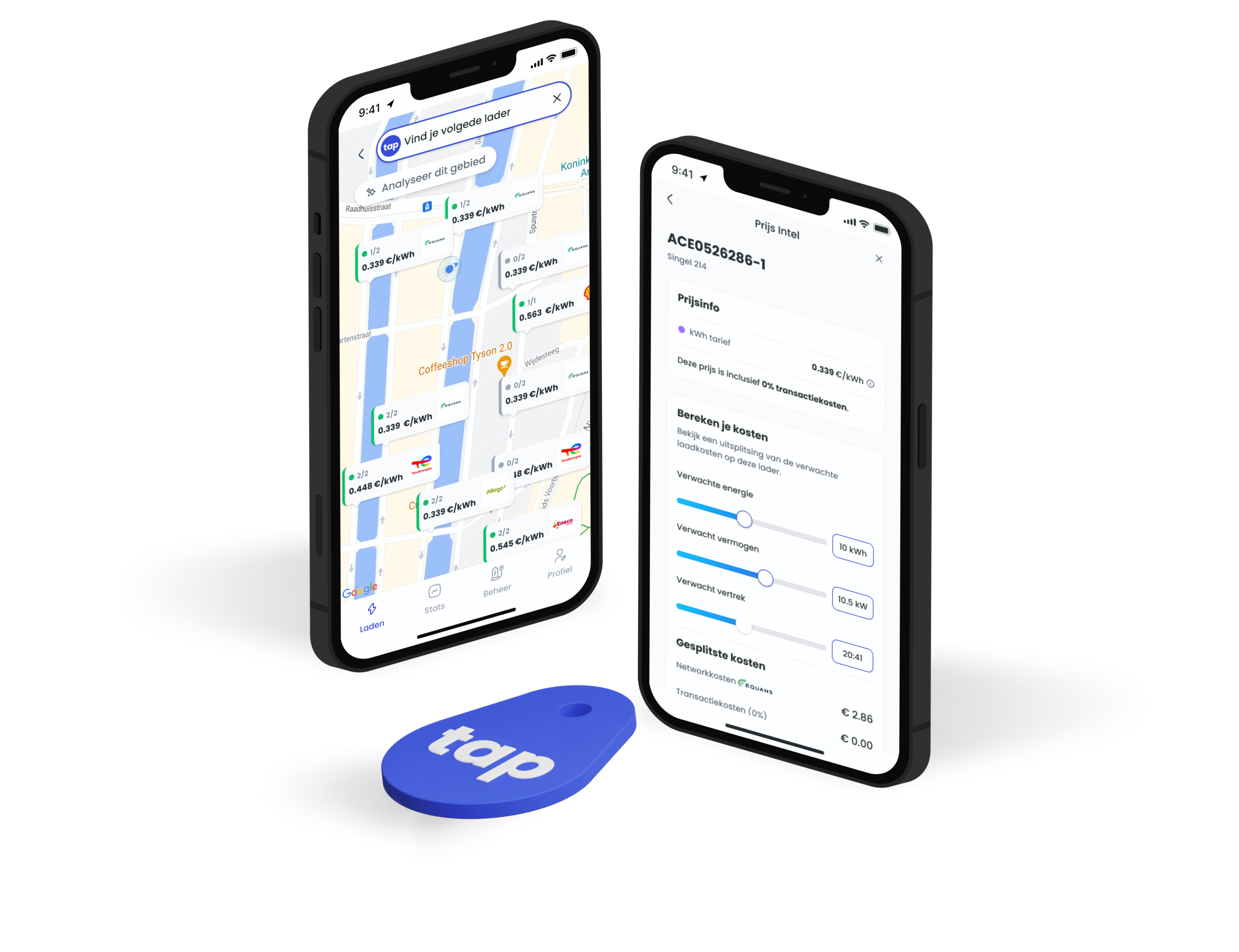 Het gebruik van een laadpas of de Tap-app is eenvoudig. De kaart in de Tap-app toont altijd alle laadpunten die je met Tap kunt gebruiken. Controleer vóór het laden altijd de actuele beschikbaarheid en prijzen in de app.
